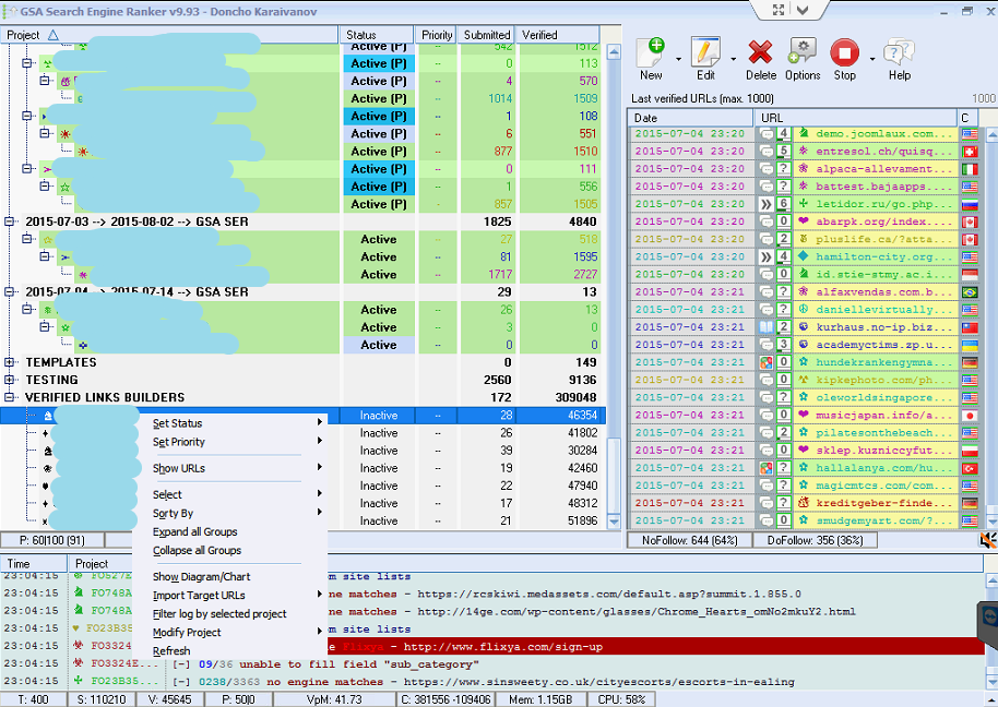 Below the “Live Links” table, you can also see the distribution between the NoFollow links and DoFollow links. So that’s it pretty much for this section of GSA Search Engine Ranker. I would suggest you not allowing way too much live links to be stored in the table so as to not hurt performance and resources.